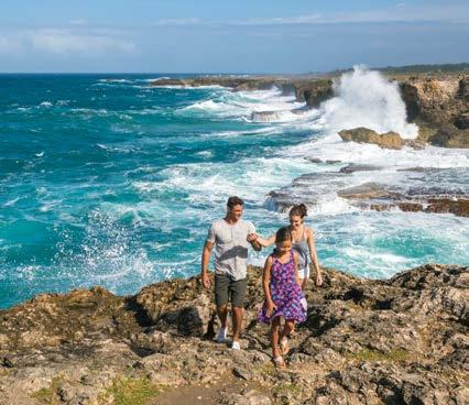 self-alignment, and freeing the spirit abound. And spas where you can de-stress and be pampered? They’re practically around every corner. If you prefer invigoration, try surfing (normal, kite- or wind-), sailing, diving, or watersports. On land, try ziplining, a steep hill climb with a hiking group, or a guided clamber into an undeveloped cave system. Get your heart pounding on a go-kart at Bushy Park or with a game of tennis or squash. It’s all available.