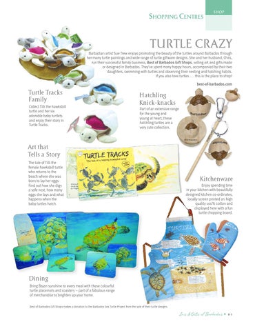 TURTLE CRAZY Barbadian artist Sue Trew enjoys promoting the beauty of the turtles around Barbados through her many turtle paintings and wide range of turtle giftware designs. She and her husband, Chris, run their successful family business, Best of Barbados Gift Shops, selling art and gifts made or designed in Barbados. They’ve spent many happy hours, accompanied by their two daughters, swimming with turtles and observing their nesting and hatching habits. If you also love turtles . . . this is the place to shop!