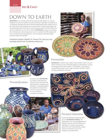DOWN TO EARTH Earthworks is no ordinary pottery! Founded by Goldie Spieler as a project designed to revive the tradition of pottery-making in Barbados, evolving into a co-operative during the 80s when several independent potters shared costs in the small studio, then growing into its present form. Today, David Spieler and his staff passionately continue to create functional works of art that will be the perfect compliment to your home’s decor! Earthworks produces an amazing line of dinnerware and serving pieces in over a hundred and fifty shapes and sizes, and forty eye-catching patterns, not counting the specialty designs produced daily at the pottery.