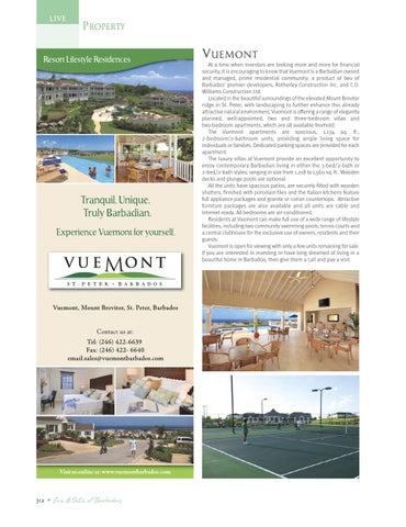 VUEMONT At a time when investors are looking more and more for financial security, it is encouraging to know that Vuemont is a Barbadian owned and managed, prime residential community; a product of two of Barbados’ premier developers, Rotherley Construction Inc. and C.O. Williams Construction Ltd. Located in the beautiful surroundings of the elevated Mount Brevitor ridge in St. Peter, with landscaping to further enhance this already attractive natural environment, Vuemont is offering a range of elegantly planned, well-appointed, two and three-bedroom villas and two-bedroom apartments, which are all available freehold. The Vuemont apartments are spacious, 1,134 sq. ft., 2-bedroom/2-bathroom units, providing ample living space for individuals or families. Dedicated parking spaces are provided for each apartment. The luxury villas at Vuemont provide an excellent opportunity to enjoy contemporary Barbadian living in either the 3-bed/2-bath or 2-bed/2-bath styles, ranging in size from 1,218 to 1,560 sq. ft. Wooden decks and plunge pools are optional. All the units have spacious patios, are securely fitted with wooden shutters, finished with porcelain tiles and the Italian kitchens feature full appliance packages and granite or corian countertops. Attractive furniture packages are also available and all units are cable and Internet ready. All bedrooms are air-conditioned. Residents at Vuemont can make full use of a wide range of lifestyle facilities, including two community swimming pools, tennis courts and a central clubhouse for the exclusive use of owners, residents and their guests. Vuemont is open for viewing with only a few units remaining for sale. If you are interested in investing or have long dreamed of living in a beautiful home in Barbados, then give them a call and pay a visit.