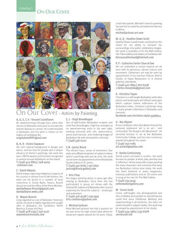 T: (246) 423-6803 | 258-4029 vishniart.com C - David Alleyne David enjoys capturing indigenous aspects of his country in vibrant true-to-life fashion. His work can be found in a number of local collections in Scotia Bank, Texaco, Round House Inn and the office of the Prime Minister.
