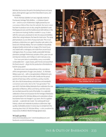 Nicholas! And across the yard is the boiling house and syrup plant, which grinds sugar cane from December to June, and the distillery. The St. Nicholas labelled rum was originally created at Foursquare Heritage Park distillery – a molasses based rum – and it is a rum of distinction, highly praised by rum connoisseur Helena Olsen (see the website). But Larry’s vision has been to produce rum on site, using the plantation’s own freshly ground cane and the traditional pot still method, in the new (awesome looking) distillery installed in 2009. It starts with the cane juice, processed on site into syrup and distilled, rather than using molasses, the base for most rums. The syrup plant produces 20,000 litres of syrup each year. This in turn produces a distinctive rum, aged in bourbon oak casks in the bond at St. Nicholas Abbey. The rum is bottled in beautifully designed bottles etched with an image of the Great House and sealed with a mahogany cork made from ancient local mahogany trees. It’s a unique, totally sustainable Nicholas plantation package! Preliminary samples of the 5 year rum are earning rave reviews, and it will go on sale in January 2015. One more point about sustainability: every conceivable combustible item – paper, boxes, palm fronds and wood from the forest around – all go into the production of brickettes to fuel the syrup plant! But what is even more extraordinary is the coincidence of this new generation of sugar cane product… St. Nicholas Abbey 5 year rum … with a new generation of Warrens! Larry and Anna’s son Simon and his wife Camilla are the proud parents of twin boys, Arthur and Henry, just four months old. Life is full of extraordinary coincidences and wonderful connections and circles. And so the “new generation” five year old St. Nicholas Abbey Barbados Rum celebrates the new generation of Warrens, Arthur and Henry, and their names are inscribed around the neck of the bottle. It is a splendid celebration of love and of passion for the heritage of Barbados and particularly of St. Nicholas Abbey and a plantation whose boundaries have not changed in 350 years. And it’s a golden example – a splendid role model - for working with local history, culture and materials to produce a distinctive, high quality, marketable product in every way, to complement the amazing place that is St. Nicholas Abbey – a site considered by many to be of UNESCO World Heritage global value. Tel (246) 422-8725 www.stnicholasabbey.com | stnicholasabbeyrum.com facebook.com/stnicholasabbey