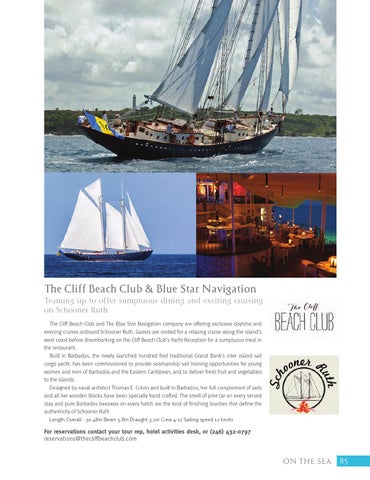 The Cliff Beach Club & Blue Star Navigation Teaming up to offer sumptuous dining and exciting cruising on Schooner Ruth The Cliff Beach Club and The Blue Star Navigation company are offering exclusive daytime and evening cruises onboard Schooner Ruth. Guests are invited for a relaxing cruise along the island’s west coast before disembarking on the Cliff Beach Club’s Yacht Reception for a sumptuous meal in the restaurant. Built in Barbados, the newly launched hundred foot traditional Grand Bank’s inter island sail cargo yacht, has been commissioned to provide seamanship sail training opportunities for young women and men of Barbados and the Eastern Caribbean, and to deliver fresh fruit and vegetables to the islands. Designed by naval architect Thomas E. Colvin and built in Barbados, her full complement of sails and all her wooden blocks have been specially hand crafted. The smell of pine tar on every served stay and pure Barbados beeswax on every hatch are the kind of finishing touches that define the authenticity of Schooner Ruth. Length Overall - 30.48m Beam 5.8m Draught 3.2m Crew 4-12 Sailing speed 12 knots