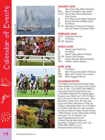 • The B’dos Horticultural Society hosts Open Gardens on Sundays from 2-6pm in Jan. & Feb. Call (246) 428-5889 or visit www.horticulturebarbados.com • The B’dos National Trust hosts Open Houses every Wed. from 2:30-5:30pm from January to March each year. Hike Barbados is held every Sunday year round and hikes take place at 6am & 3:30pm. Moonlight hikes are at 5:30pm. Call (246) 426-2421 for hike calendar as well as details of Open House venues. • Polo Season is from December to May each year. For full details visit: www.barbadospoloclub.com • Horse Racing takes place on Saturdays throughout the year. Call (246) 626-3980 or visit: www.barbadosturfclub.org