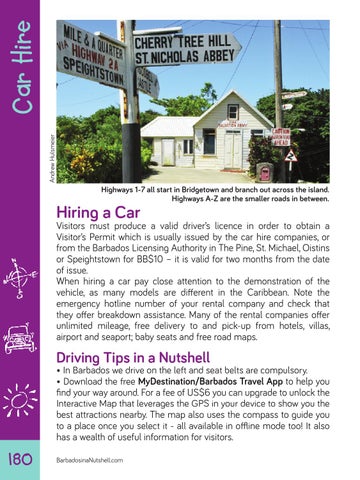 • In Barbados we drive on the left and seat belts are compulsory. • Download the free MyDestination/Barbados Travel App to help you find your way around. For a fee of US$6 you can upgrade to unlock the Interactive Map that leverages the GPS in your device to show you the best attractions nearby. The map also uses the compass to guide you to a place once you select it - all available in offline mode too! It also has a wealth of useful information for visitors.