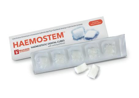 Haemostem ™ Dental Cubes containing carboxycellulose. Easy insertion into tooth sockets to control protracted postextractional capillary bleeding. Each cube contains 135mg of micronised modified carboxycellulose with 25mg methycellulose and 40mg modified starch which acts as gelling and disintergrant agents. Haemostem ™ offers highly effective antimicrobial effects which may aid the healing process.