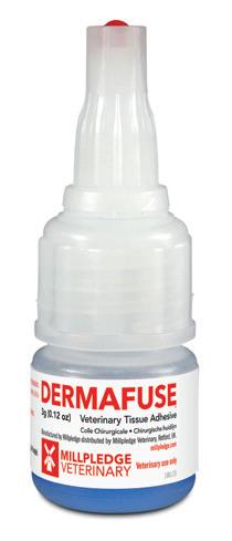 Superior bonding in seconds. Dermafuse™ Tissue Adhesive is an n-butyl cyanoacrylate medical adhesive used to bond tissue together following veterinary procedures (i.e. lacerations, abrasions, suture/staple line sealing, tooth extractions, oral surgeries, spaying/neutering and dewclaw removal). Product contains blue dye to allow user to easily see where product has been applied.