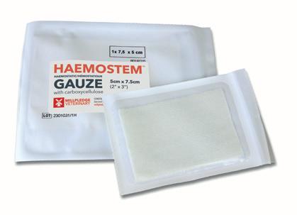 Haemostem™ Gaze, ist ein fein gewebtes, dünnes, zerbrechliches Polster aus modifizierten Carboxyzellulosefasern. Sie kann auf Wundoberflächen von Weichteilen und inneren Organen genäht oder geschichtet werden. Für die Umhüllung von Anastimosen, wie die der arteriellen und venösen Gefäße und des Verdauungstraktes, oder von Leberbiopsien.