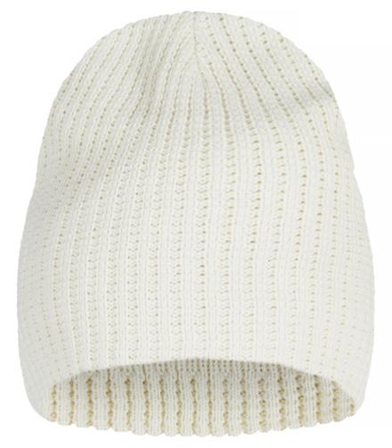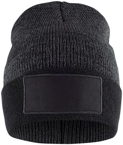 Alareunasta käännetty pipo heijastavalla neuloksella. Edessä sileä paikka painatusta varten, koko 4,5 x 9,5 cm.