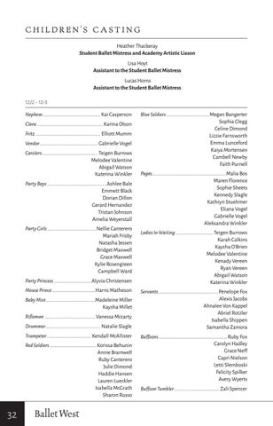 CHILDREN'S CASTING Heather Thackeray Student Ballet Mistress and Academy Artistic Liason Lisa Hoyt Assistant to the Student Ballet Mistress Lucas Horns Assistant to the Student Ballet Mistress 12/2 - 12-3 Nephew............................................. Kai Casperson Clara.................................................... Karina Olson Fritz................................................... Elliott Mumm Vendor.............................................. Gabrielle Vogel Carolers............................................ Teigen Burrows Melodee Valentine Abigail Watson Katerina Winkler Party Boys...............................................Ashlee Bale Emmett Black Dorian Dillon Gerard Hernandez Tristan Johnson Amelia Weyerstall Party Girls.......................................Nellie Canterero Mariah Frisby Natasha Jessen Bridget Maxwell Grace Maxwell Kylie Rosengreen Campbell Ward Party Princess..............................Alyvia Christensen Mouse Prince..................................Harris Matheson Baby Mice.......................................Madeleine Miller Kaysha Millet Rifleman........................................ Vanessa Mccarty Drummer........................................... Natalie Slagle Trumpeter................................... Kendall McAllister Red Soldiers..................................... Korissa Behunin Annie Bramwell Ruby Canterero Julie Dimond Haddie Hansen Lauren Lueckler Isabella McGrath Sharon Russo