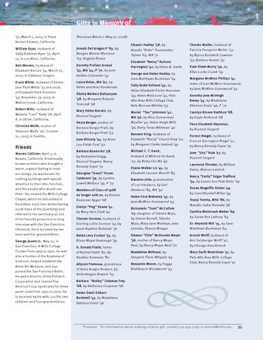 Vesta Berger, mother of Barbara Berger Pratt, by Barbara Berger Pratt ’53 June Bilisoly ’54, by Anna Lou Fields Ford ’52 Barbara Bundschu ’38, by Katharine Gregg, Roussel Sargent, Nancy Kenealy Soper ’51 Georgine “Greni” Porter Caldecott ’39, by Cynthia Lowell Wallace ’39, P ’77 Members of Class of 1968 no longer with us, by Kristen Reasoner Apgar ’68 Evelyn “Peg” Deane ’41, by Mary Hart Clark ’42 Chester Dorman, husband of Sterling Loftin Dorman ’47, by Janet Hopkins Richards ’36 Relda Levy Eschen ’33, by Diane Meyer Keebaugh ’59 G. Donald Flaith, father of Rachel Flaith ’80, by Heather Summers ’80 Allyson Fremouw, grandniece of Anita Aragon Bowers, by Anita Aragon Bowers ’63