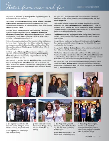 Ten alumnae from the Oakland–Berkeley Branch, Alumnae Association of Mills College, gathered on February 27 for a guided tour of the Victorian Cohen-Bray House, an Oakland landmark listed in the National Register of Historic Places. President Janet L. Holmgren was the guest of honor at a reception attended by over 50 alumnae from the Los Angeles Mills College Alumnae and Orange County Mills College Alumnae groups. The event was hosted by Pamela Mayers Schoenberg, MFA ’94, at her gallery, dnj Gallery in Santa Monica, on March 6. Sixteen alumnae attended a tour of San Francisco’s Asian Art Museum led by Art History Professor Mary-Ann Milford-Lutzker. The March 12 event was sponsored by the Educational Outreach Committee of the Alumnae Association of Mills College and the Mills College Office of Alumnae Relations. On March 24, the Mills College Office of Alumnae Relations hosted 25 recent graduates at a happy hour celebrating Women’s History Month. Saxophonist Sonja Jason ’83 and pianist Tammy Hall ’83 performed with their jazz trio. Also on March 24, the Palo Alto Area Mills College Club hosted a happy hour for recent graduates at MacArthur Park Restaurant in Palo Alto. The 15 alumnae who attended had a chance to catch up with each other and to meet Tonia Blackwell, associate dean of the Division of Student Life at Mills.