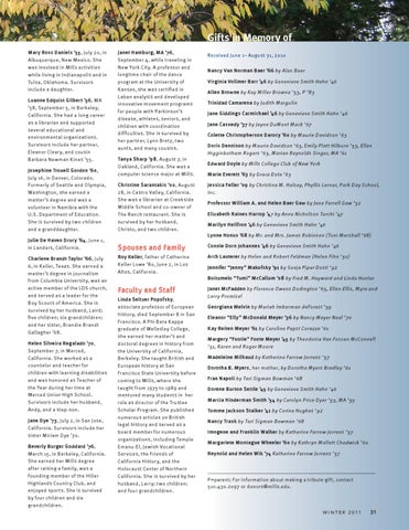 Professor William A. and Helen Baer Gaw by Jane Farrell Gaw ’52 Elizabeth Raines Harrop ’47 by Anne Nicholson Turchi ’47 Marilyn Heilfron ’46 by Genevieve Smith Hahn ’46 Lynne Honus ’68 by Mr. and Mrs. James Robinson (Toni Marshall ’68)