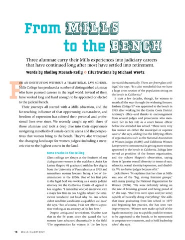 From Mills to the Bench Three alumnae carry their Mills experiences into judiciary careers that have continued long after most have settled into retirement. Words by Shelley Moench-Kelly ◊ Illustrations by Michael Wertz OR AN INSTITUTION WITHOUT A TRADITIONAL LAW SCHOOL,