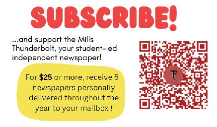 Our names are Michaela Gonzalez (12) (left) and Phoebe Piserchio (11) (right), and on behalf of the Thunderbolt Staff, we are thrilled to debut as the new Editors-in-Chief of The Mills Thunderbolt. We are honored to have this opportunity to work with such an incredible team of writers, editors, and photographers to continue the tradition of journalism at Mills. Our passion for keeping Mills community informed motivates us to continue the long legacy of Editors-in-Chief before us. We take on the duty of reporting local news and student opinions in order to main tain an informed student environment. Entering our 65th year, we hope to create, narrate, and resonate with student voices.