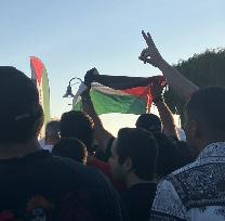 BAY AREA PALESTINE DAY FESTIVAL:Palestinian fags and peace signs raised.