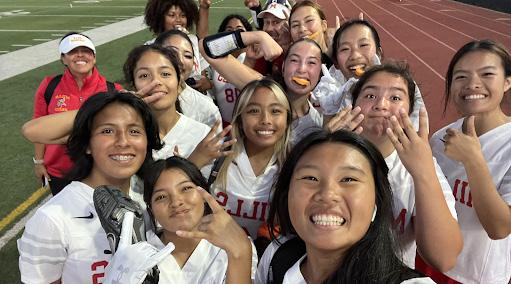 holds up “W’s” signifying their first victory of the anticipated season. team, Ithzel Ramirez Macias (11), commented on this subject: “Some experience I had prior to the Mills team on football was playing it as a PE unit growing up. But it made me interested in playing football because it was a big impact to the community having a new girl sport for female athletes who also enjoy football.”