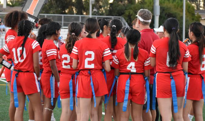 FLAG FOOTBALL TEAM: The team huddling before the scrimmage.