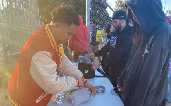 BAG CHECKS: AP White gives a bag check to a student at a football game.