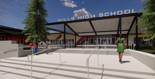 The construction in front of Mills is projected to be fnished by November and will include a complete redesign of the front of the school and the total removal or encapsulation of the remaining transite in the school.