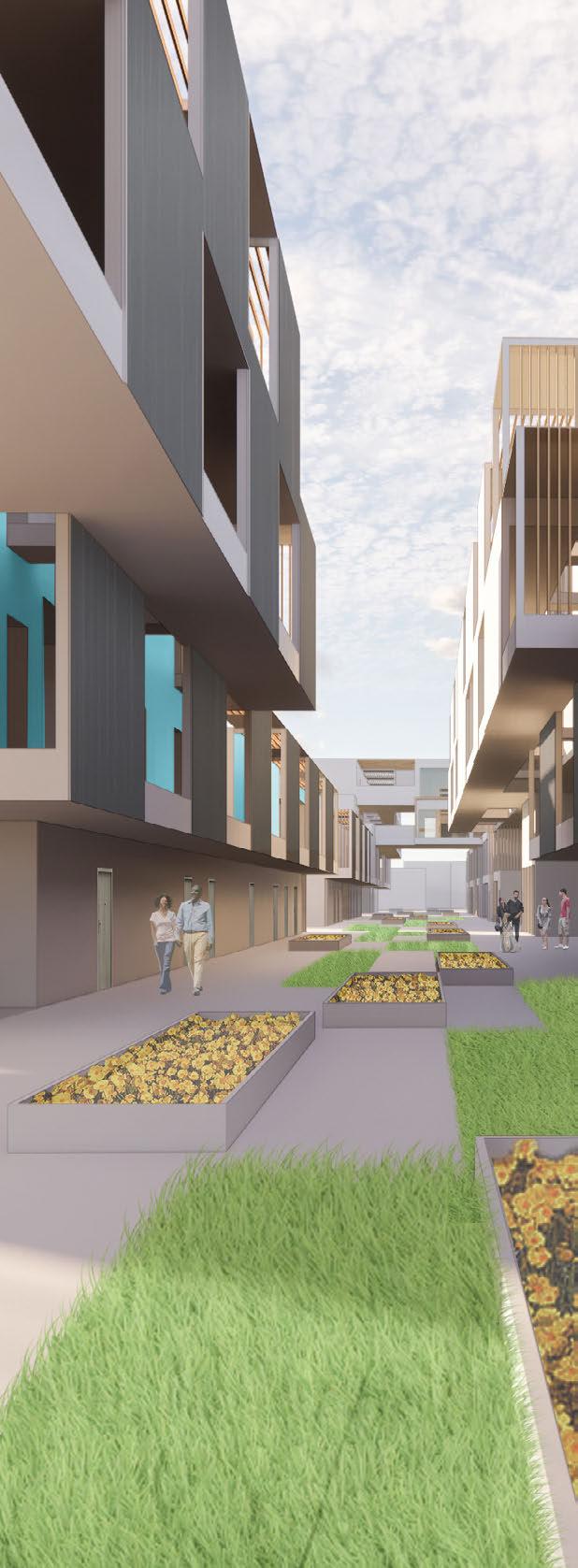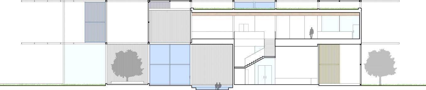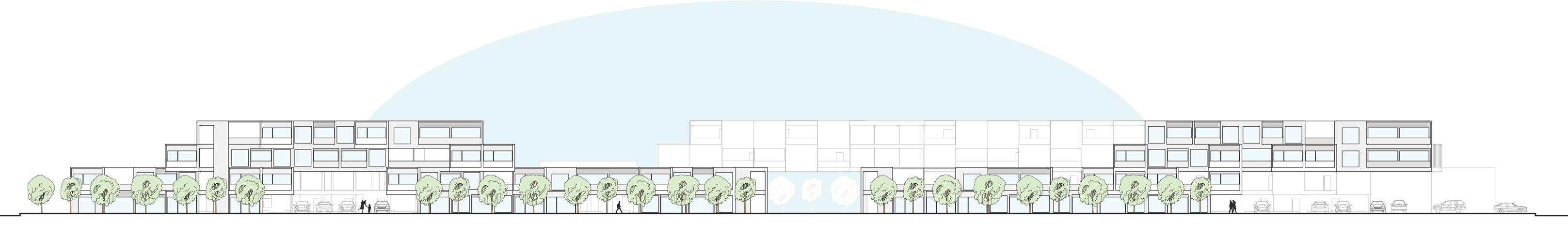 This is a proposal for a high density housing complex in the historically low density neighborhood of Mar Vista in Los Angeles. One of the primary goals of this proposal is to seamlessly integrate public park space with architecture by creating a series of linear bars which meander around the site to create and define open space. These bars move vertically and horizontally around the site to define a central linear park, and create a variety of both paved and green open spaces. The bars are made up of a variety of unit types organized in a loose elevational grid, with individual spaces for units being removed throughout to create a field of semi-private outdoor spaces. The facades of each individual unit type have varying depth, creating a building facade which pushes and pulls away from the street. The project uses layered galleries for circulation on upper levels of the building. These galleries have a series of dark metal panels arranged in a field which conceal and reveal a bright, contrasting blue wall to bring a sense of visual parallax depth while inside its park spaces.