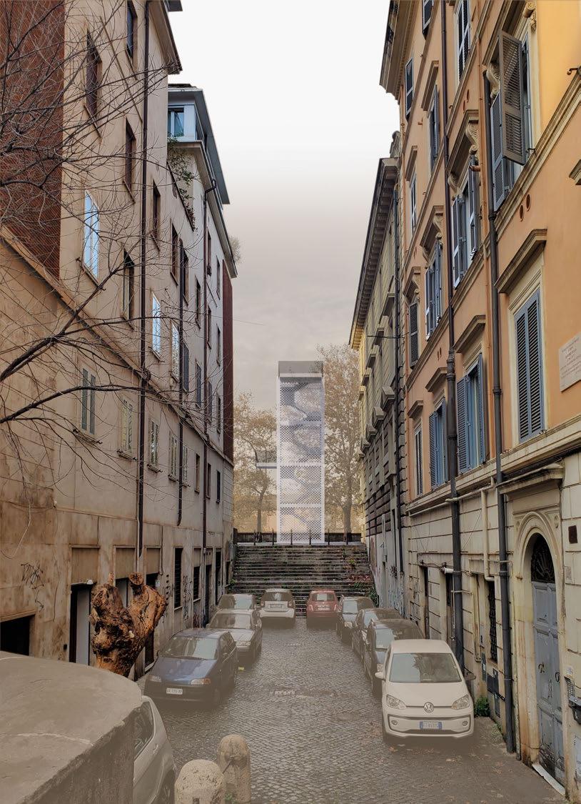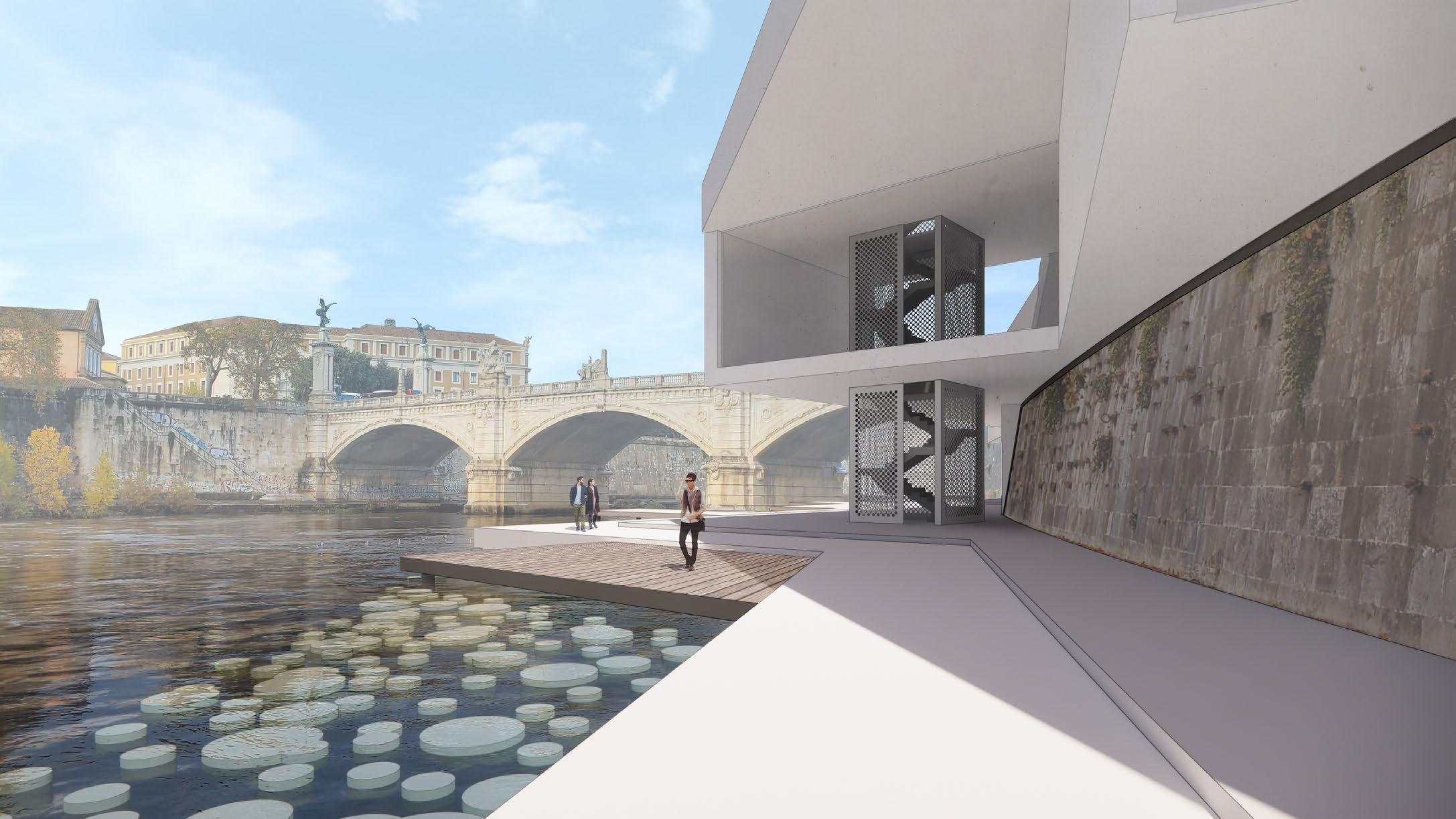 This proposal for a museum of the Tiber River tells the story of Rome through the lens of its iconic river. The proposal is a linear building built into the embankment walls of the Tiber river, and creates three levels which include the level at the streetscape, the level of the river, and an intermediate level which houses most of the interior space of the museum. From the street level three new points of access to the riverwalk are created. One at each end of the museum, and one in between that is part of a lookout tower which can bring you to an observation level as well as down to the riverwalk. This tower is aligned with Via Giulia, allowing a view of the entire street as well as of Gianicolo hill. Each of these points of access allow users to enter the museum or go directly to the river level. At the river level is a cafe, as well as exterior spaces for occupation and wooden walkways that give a close up view of the ruins of Ponte Trionfale and gardens of native riparian vegetation. The main interior level of the museum provides a variety of exhibition space with a shifting form that orients views to provide focus for exhibitions.