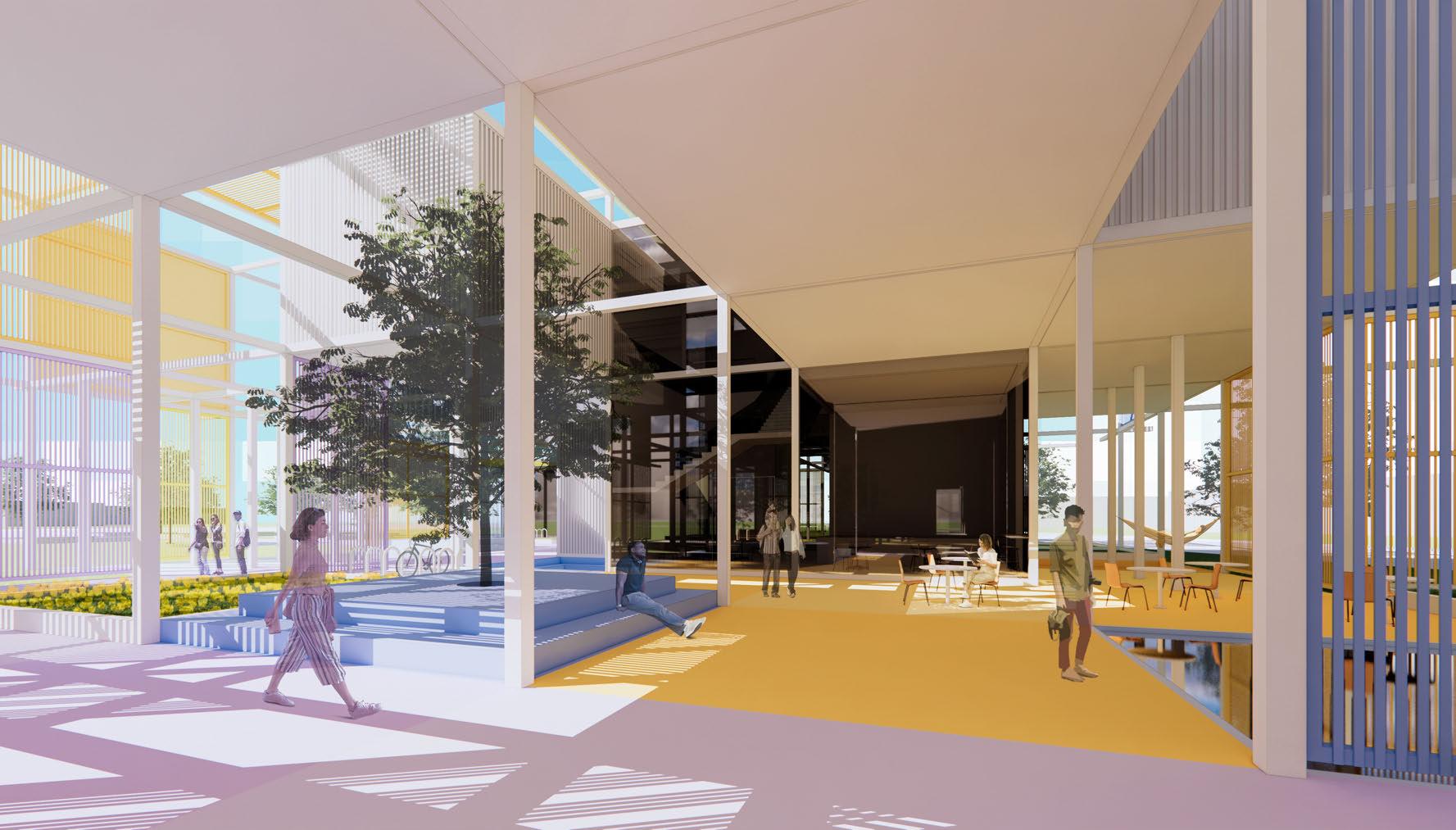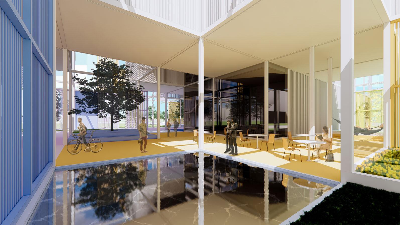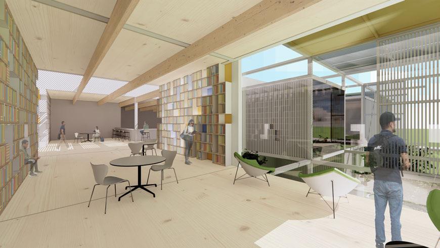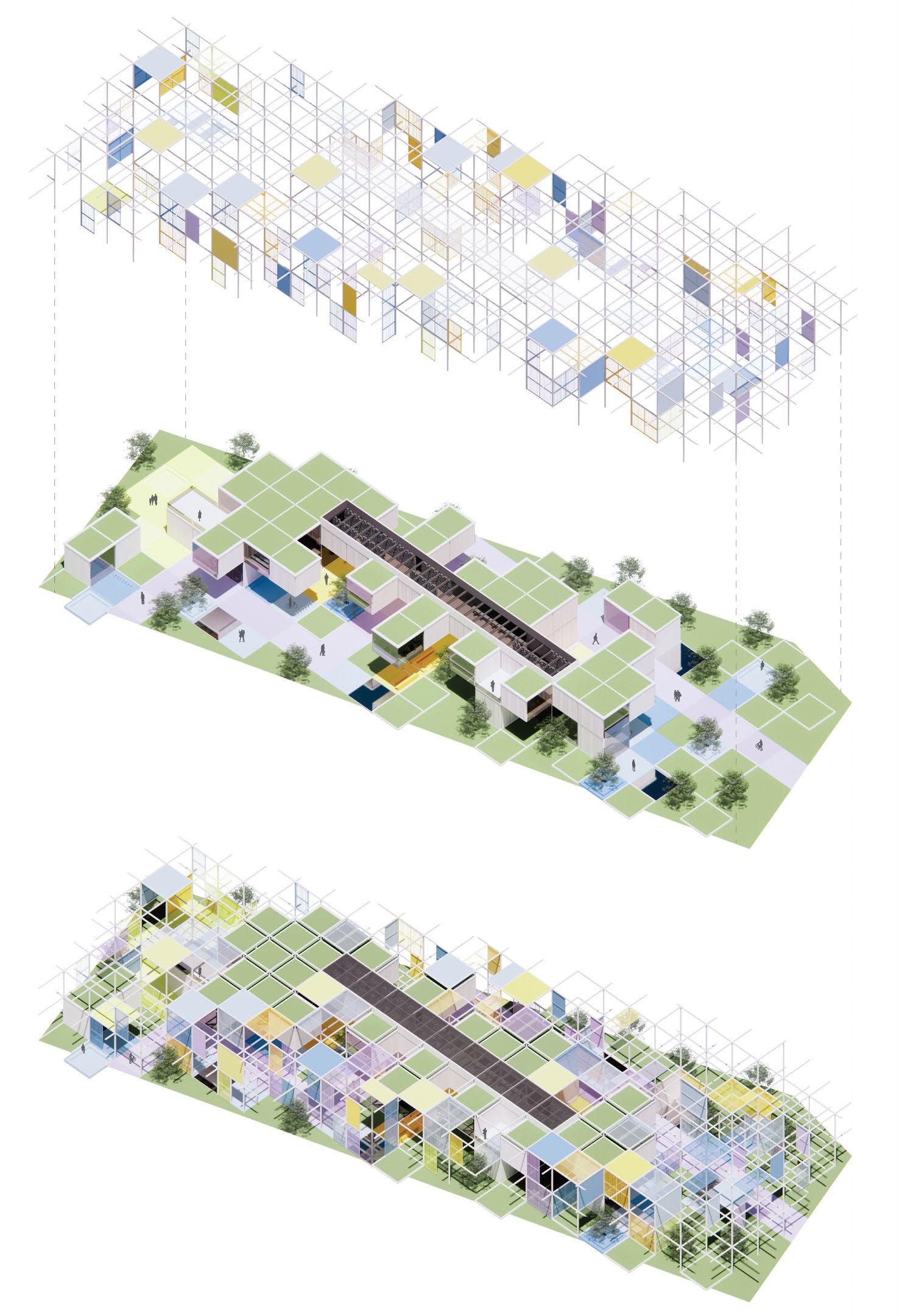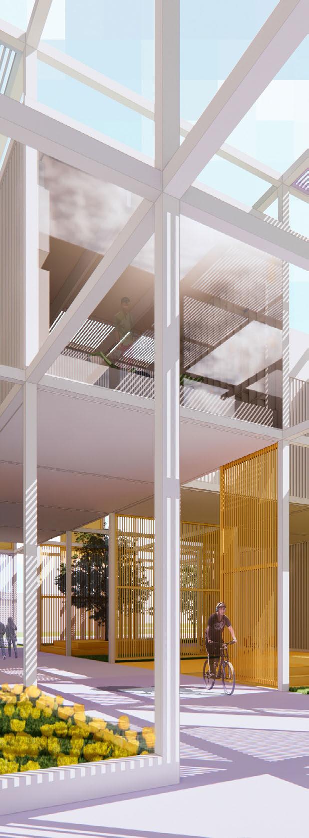 Sited adjacent to the Jones recreation center in Springdale, Arkansas, this proposal for a library and community center blends outdoor public space and architecture with a cubic grid that permeates across the project’s entire site. Various ‘pixels’ populate the grid, creating a variety of outdoor public space with different scales, levels of privacy, levels of shade, and functions. The different types of outdoor spaces within the grid are indicated by the color of each pixel. Pixels with the same color are related in their function or the intended space that they serve. The form of the building is fit within this grid as well, and uses the cubic grid as a superstructure, allowing large portions of the building to feel as though they are floating. The building is detailed to enhance this feeling of lightness, glass panes extend past the structural thickness of the floors and roof to meet the tube steel of the cubic grid, and deeper beams are hidden behind the thin exposed tube steel. A field of canopies permeate the cubic grid as well, providing varying levels of shading for both the interior and exterior spaces. The materiality of the building in contrast to the surrounding colorful elements is made up of white metal to allow for a soft reflection of these colors. A path runs through the site connecting the Jones center to the existing bike trail south of it, further treating the site as a combination of outdoor public space and architecture and enhancing its presence in the urban environment.