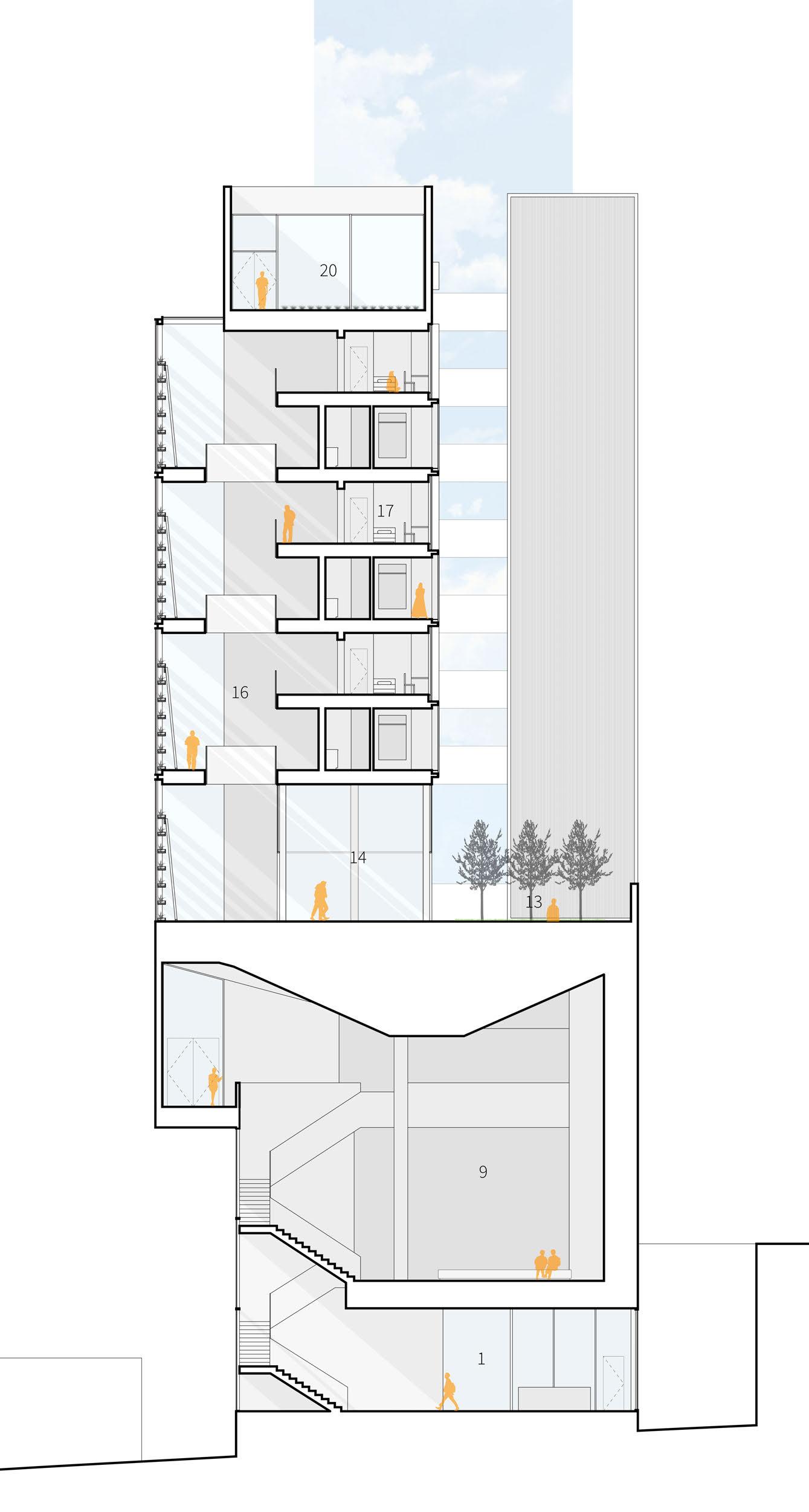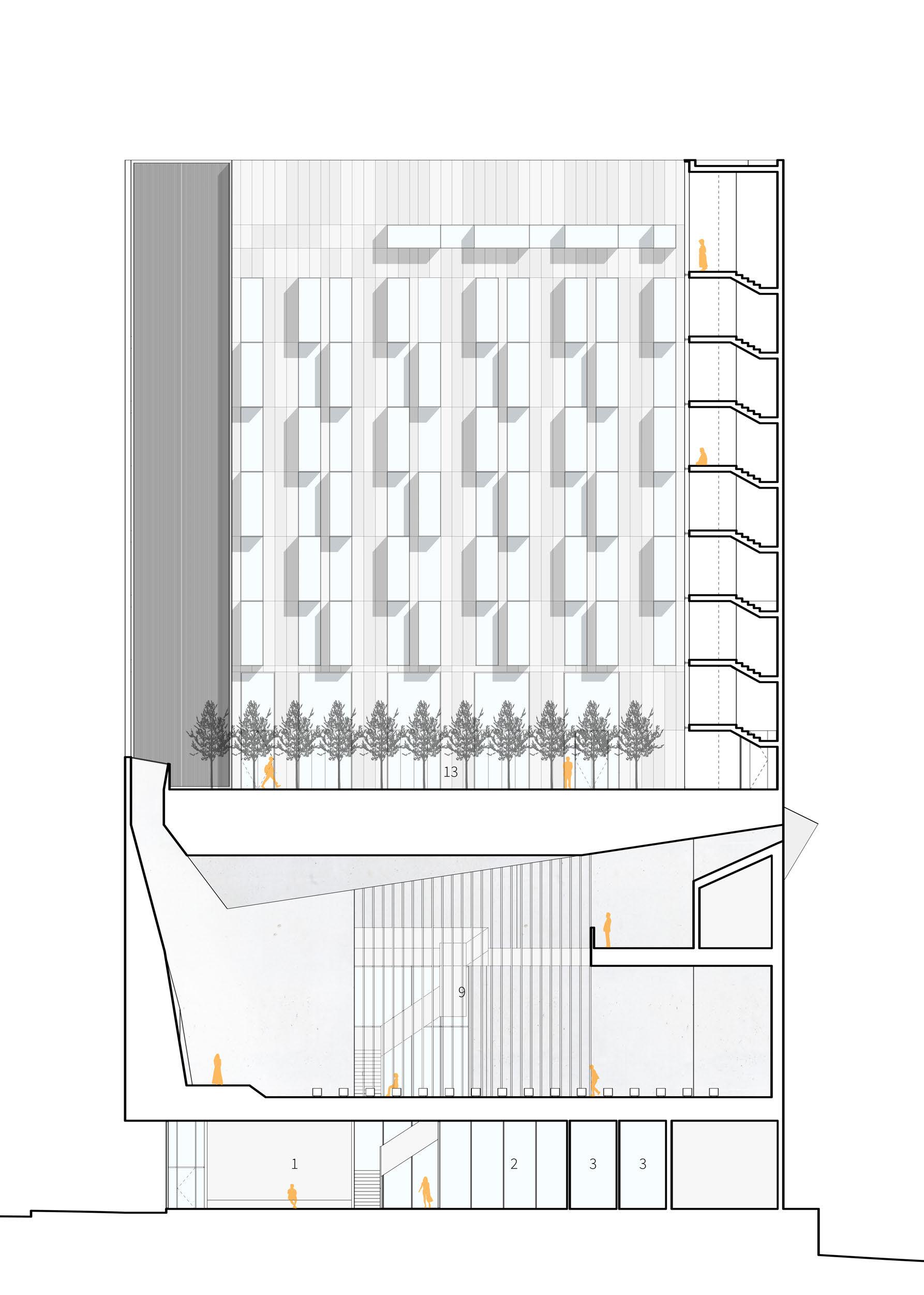 The typical program of a monastery involves the cloister, a church, chapels, residences, and space for working or farming. Historically, this has taken on an expansive horizontal typology, and with this studio we were tasked to create a new typology by taking this historically expansive form and imagining it on a small site in an urban context. The site of the proposal is on a small urban parking lot in downtown Austin, Texas. The program challenged me to examine how the relationships between these various programs typically fit in a horizontal context and discover how I can maintain these relationships when the monastery becomes vertical. Being urban, how does the building interface with and serve the city, and what is the relationship between the public areas and the private areas for the monks? In the traditional typology of a monastery, the organization of the spaces revolve around the cloister, a square centralized courtyard with covered walkways on all sides that take people between the various spaces and separates the spiritual, residential, and working spaces. In translating this to a vertical structure for my proposal, the cloister remains in a centralized location in the vertical organization of spaces. The covered walkways take the form of the two primary vertical circulation cores, which each face the exterior space of the cloister, maintaining the visual connection between the courtyard and the circulation present in the traditional typology. The public and community oriented spaces are placed lower in the organization while the private and monk oriented spaces are placed higher. The interiors of the spiritual spaces are made with concrete that is formed to create hidden apertures for zenithal light. The east side of the building consists of a large vertical greenhouse wall where the monks engage in their traditional work of farming but in a vertical urban context. The front facade is mostly opaque to create privacy and introspection for the spiritual and residential spaces to the outside world, but becomes completely transparent at the ground level where the building interfaces with the public. This opaque portion of the facade also acts as a monolith that gives a strong formal identity to the project.