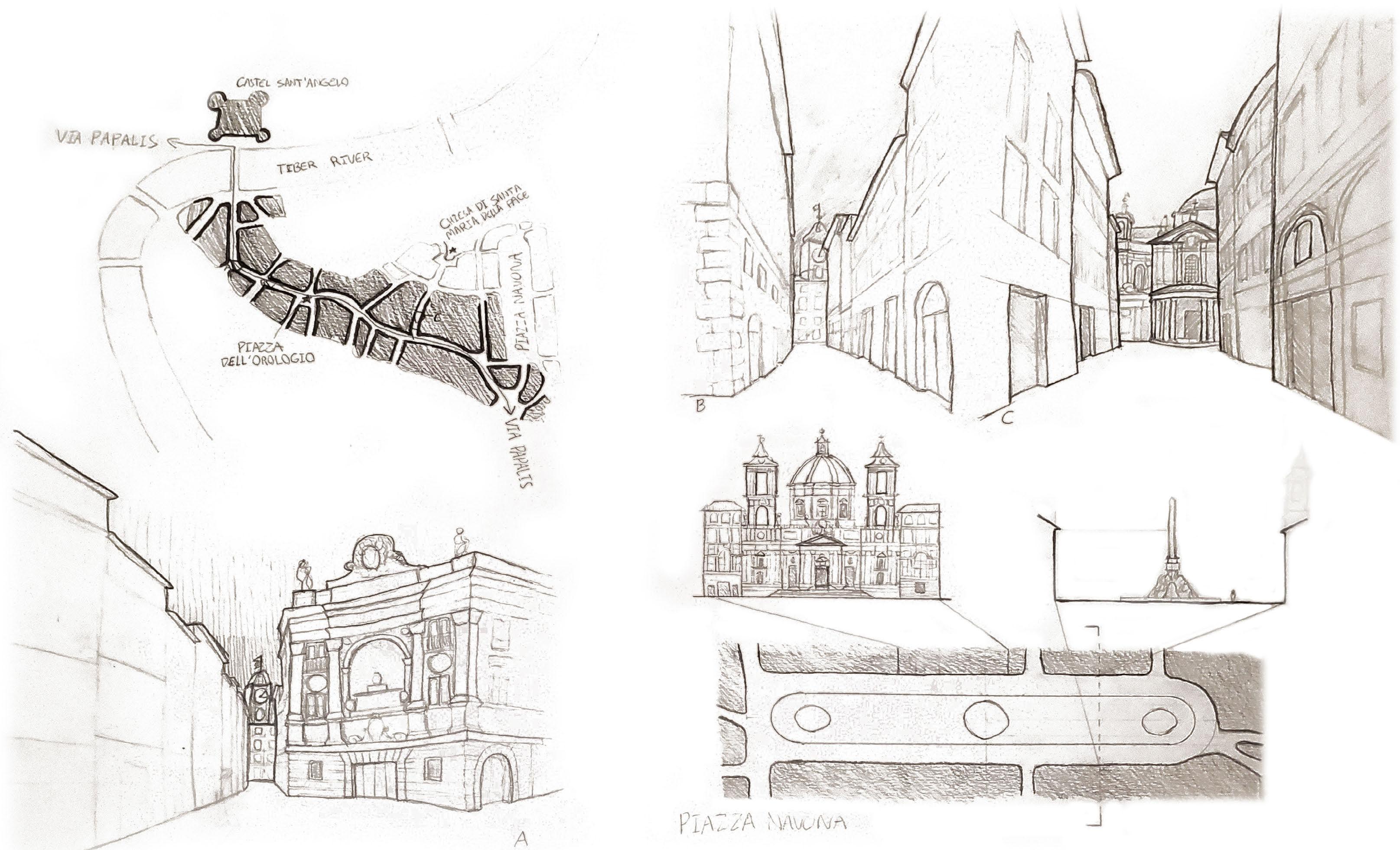 During my semester in Rome I took a course called Architecture of the City. In this course we were given walking tours of the historic center of Rome and asked to sketch various significant buildings and spaces. The course centered around the “Via Papalis” or the “Pope’s Road”, a path that every new pope takes that starts at Saint Peter’s Basilica on the west side of the historic center and ends at the Basilica of Saint John Lateran on the east side of the historic center. From our on site sketches we were asked to draw boards representing specific segments of the Via Papalis, some of which are shown here.