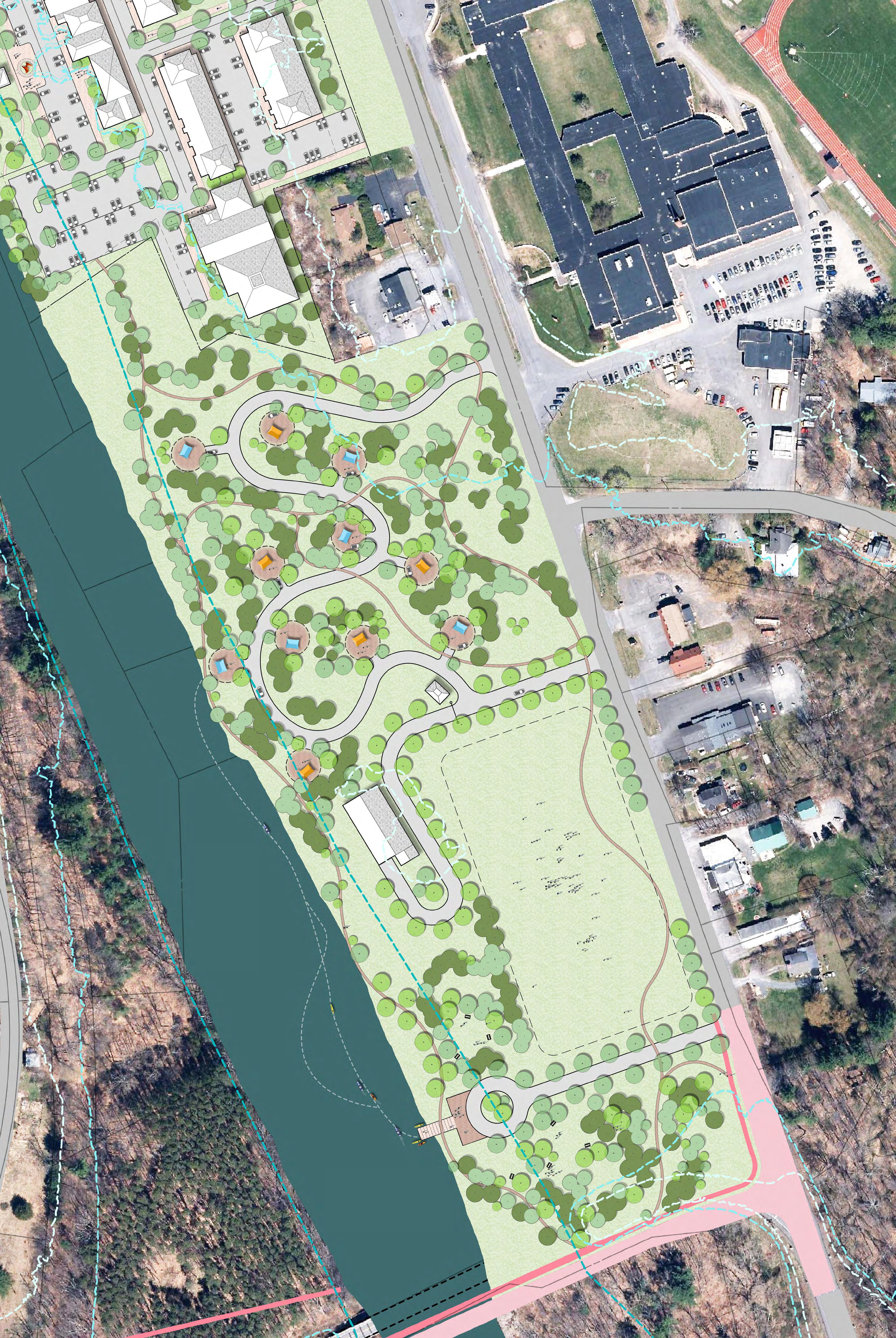 With the relocation of the existing shopping plazas and businesses, the large land area within the 100-year floodplain would become vacant. The newly vacated land area could become a riverfront park with a range of recreational activities and amenities that are appropriate for a flood-prone area such as a picnic area, stream access, large event space, or walkway trails (See Figure 6-4). The stream access, along with the future Ashokan Rail Trail, could help bolster tourism in the hamlet and provide a larger customer base for existing businesses. The development of the relocation site in combination with the proposed riverfront park can be viewed in Figure 6-5.