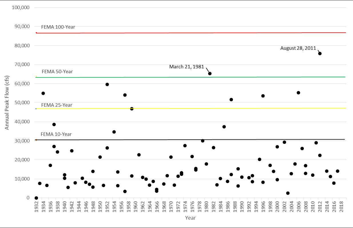 According to data collected at the stream gauge station just upstream of the commercial hamlet area, the Esopus Creek at Coldbrook gauge, there have been a total of 12 flood events that have exceeded the 10-year flood since 1932. Of these 12 floods, nine exceeded the 25-year flood, and two were greater than a 50-year flood event (See Figure 2-2). Boiceville has not experienced a 100-year flood, at least not since 1932.