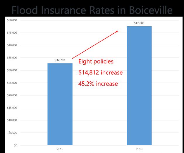 As a community participating in the National Flood Insurance Program (NFIP), properties within the town of Olive are able to purchase flood insurance through the Federal Emergency Management Agency's (FEMA) NFIP. There are currently eight flood insurance policyholders in the hamlet of Boiceville. The cost of flood insurance has increased dramatically on these policies since 2015. In 2015, the cost of the eight policies was $32,793, and this cost has increased 45 percent to $47,605 in 2018 (See Figure 2-6).