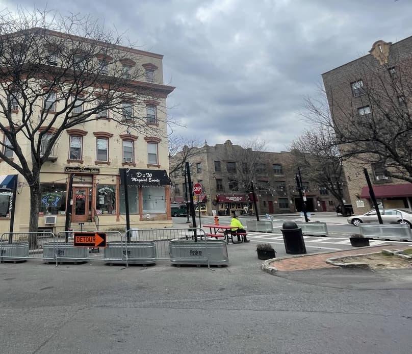 North of Chestnut Street, Cortlandt Street connects to Beekman Avenue, Sleepy Hollow’s primary commercial corridor. Most of the business façades on this stretch of Cortlandt require some maintenance/cleaning but have attractive window displays and clear signage. The building at 185 Cortlandt Street has peeling paint (see Photo 12). Two ground-floor businesses are currently vacant—110 Beekman Avenue and 194 CortlandtStreet.A public outdoor seatingarea with picnic tables, string lights, and planters is located at the southwest corner of Cortlandt Street, where it intersects with Beekman Avenue (see Photo 13).