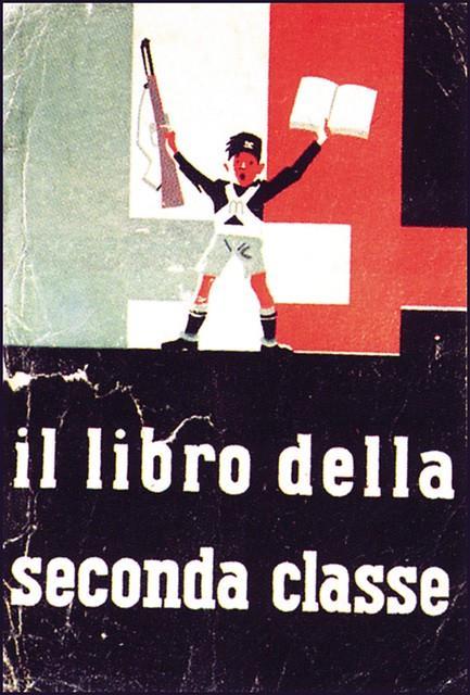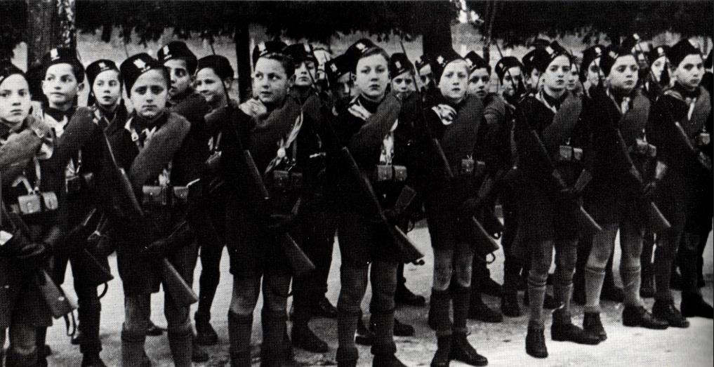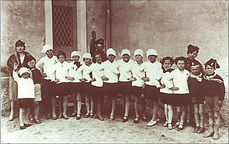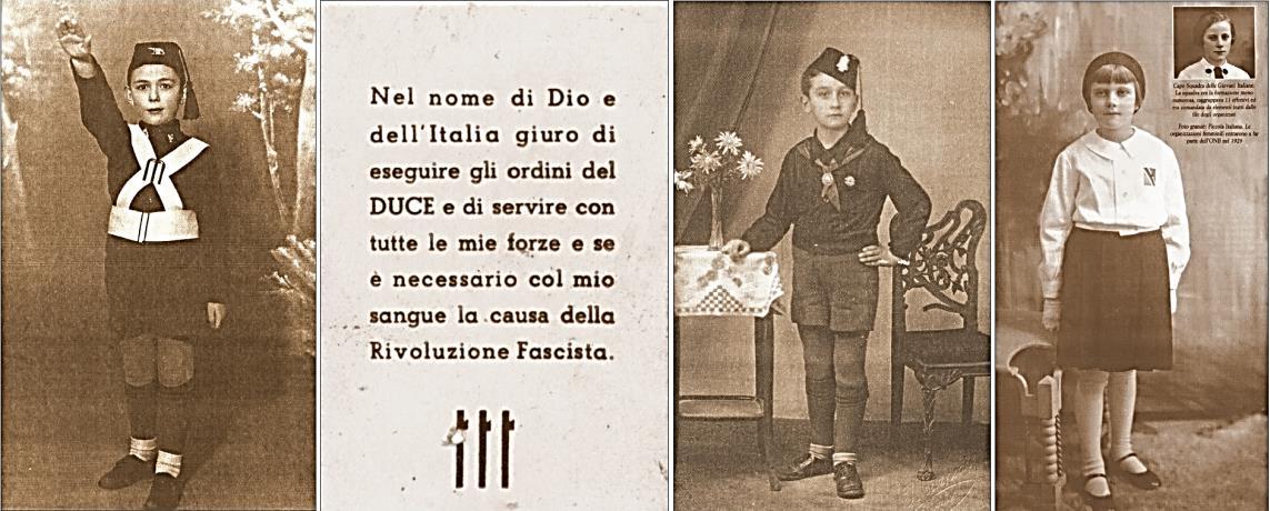 Otroci v fašističnih uniformah: Figli della lupa(otroci volkulje), Balilla, Piccole Italiane (male Italijanke). Vmes tekst njihove zaprisege: »V imenu boga in Italuije zaprisegam, da bom izvševal vse ukaze Duceja in da bom služil fašistični revoluciji z vsemi svojimi močmi, po potrebi tudi krvjo.« Vir: Pokrajinsk imuzej Koper.