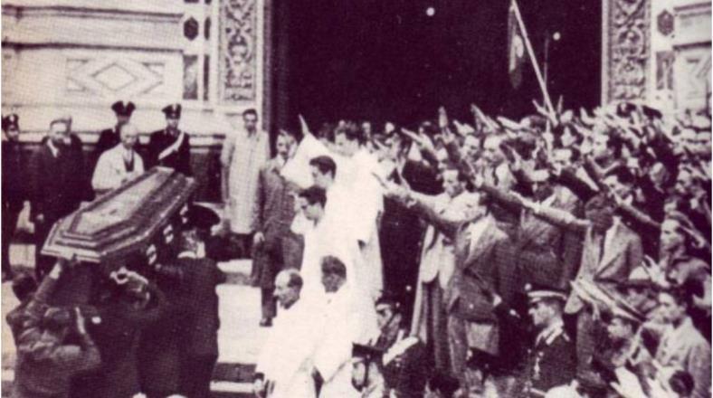 Pogreb Giovannija Gentileja z množičnim fašističnim pozdravom (Vir: Vikipedia)