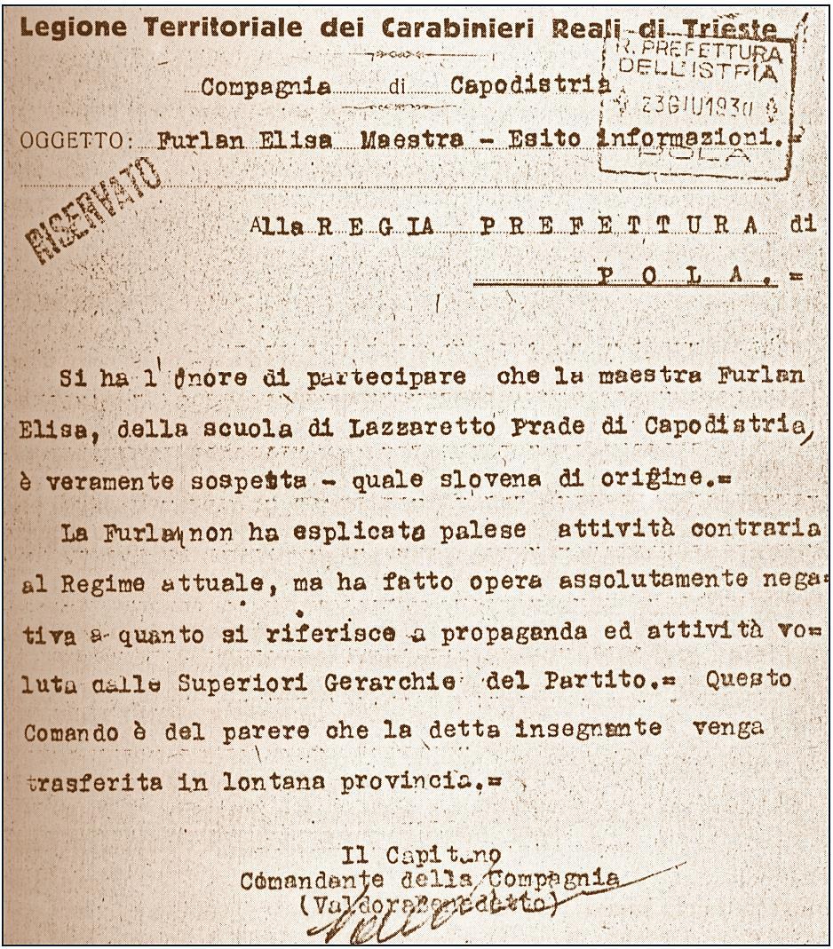 Pisni predlog da se prestavi učiteljico iz Prad, ker je po rodu slovenka. Vir Pokrajinski arhiv Koper.