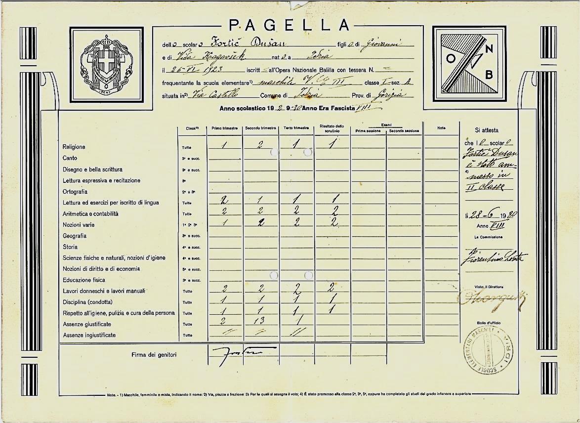 Spričevalo Dušana Fortiča, naslovna zunanja stran in notranji. Ocene so bile obratno kot danes, najboljša je bila 1, negativna pa 5.