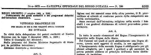 Slika uradnega lista, v katerem je bil objavljen odlok, ki uvaja Gentilejevo šolsko reformo
