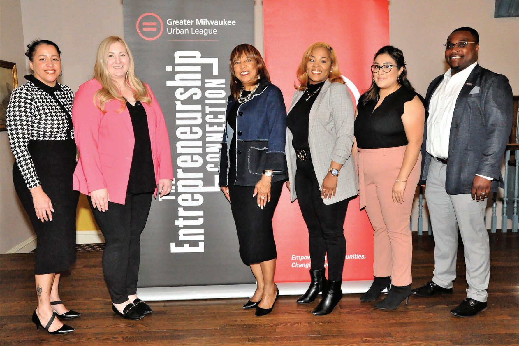 The Greater Milwaukee Urban League (GMUL) and Molson Coors hosted "The Power of Capital," the latest in a series of events in the Entrepreneurship Connection Program, on Monday, April 24, 2023, at the University Club, 924 E. Wells St. Entrepreneurs from across the greater Milwaukee area gathered to hear from financial experts on raising capital to launch and sustain their business ventures. The program also features a radio show on 101.7 The Truth as well as 150 free memberships to the Lonely Entrepreneur, an online platform that provides support in a variety of areas to help entrepreneurs grow their businesses. Pictured at the event are (from left) BMO Bank Senior Manager Industry Verticals Denisse Pachuca; Associated Bank VP Business Loan Product Manager Ashley Lucas; Greater Milwaukee Urban League’s President and CEO Dr. Eve M. Hall; PNC Bank VP Community Development Banking Marquita Hicks; PNC Bank VP Business Banking Vanessa Sancha; and US Bank VP Business Banking Daniel Anthony.