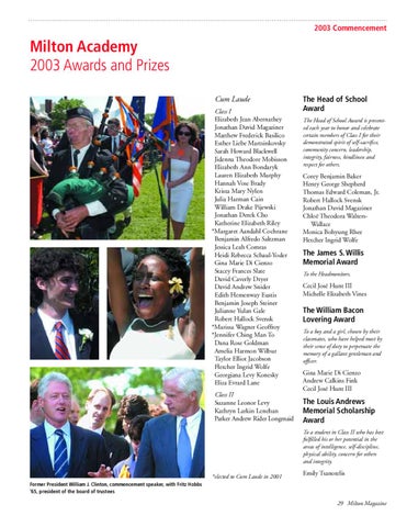Milton Academy 2003 Awards and Prizes Cum Laude Class I Elizabeth Jean Abernathey Jonathan David Magaziner Matthew Frederick Basilico Esther Liebe Martsinkovsky Sarah Howard Blackwell Jidenna Theodore Mobisson Elizabeth Ann Bondaryk Lauren Elizabeth Murphy Hannah Vose Brady Krista Mary Nylen Julia Harman Cain William Drake Pijewski Jonathan Derek Cho Katherine Elizabeth Riley *Margaret Aandahl Cochrane Benjamin Alfredo Saltzman Jessica Leah Comras Heidi Rebecca Schaul-Yoder Gina Marie Di Cienzo Stacey Frances Slate David Caverly Dryer David Andrew Snider Edith Hemenway Eustis Benjamin Joseph Steiner Julianne Yulan Gale Robert Hallock Svensk *Marissa Wagner Geoffroy *Jennifer Ching Man To Dana Rose Goldman Amelia Harmon Wilbur Taylor Elliot Jacobson Fletcher Ingrid Wolfe Georgiana Levy Konesky Eliza Evrard Lane Class II Suzanne Leonor Levy Kathryn Larkin Lenehan Parker Andrew Rider Longmaid