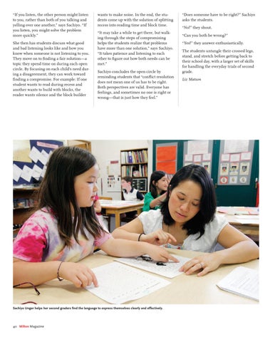 wants to make noise. In the end, the students come up with the solution of splitting recess into reading time and block time. “It may take a while to get there, but walking through the steps of compromising helps the students realize that problems have more than one solution,” says Sachiyo. “It takes patience and listening to each other to figure out how both needs can be met.” Sachiyo concludes the open circle by reminding students that “conflict resolution does not mean one of us has to be right. Both perspectives are valid. Everyone has feelings, and sometimes no one is right or wrong—that is just how they feel.”