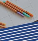 Jak jsi o jejich designu přemýšlela? Úplně původně jsem si hrála s typografií, s čísly a grafickými motivy. Ale pořád jsem nebyla stoprocentně spokojená. Pár dní potom jsem jela metrem a všimla si natažených kabelů podél kolejí, které se při jízdě míhají za oknem a tvoří dlouhé pruhy. A tak mě to trklo a řekla jsem si, jo, uděláme je pruhované! Nakonec se to ukázalo jako nejelegantnější řešení. Počet pruhů symbolizuje počet dnů v plánovači.