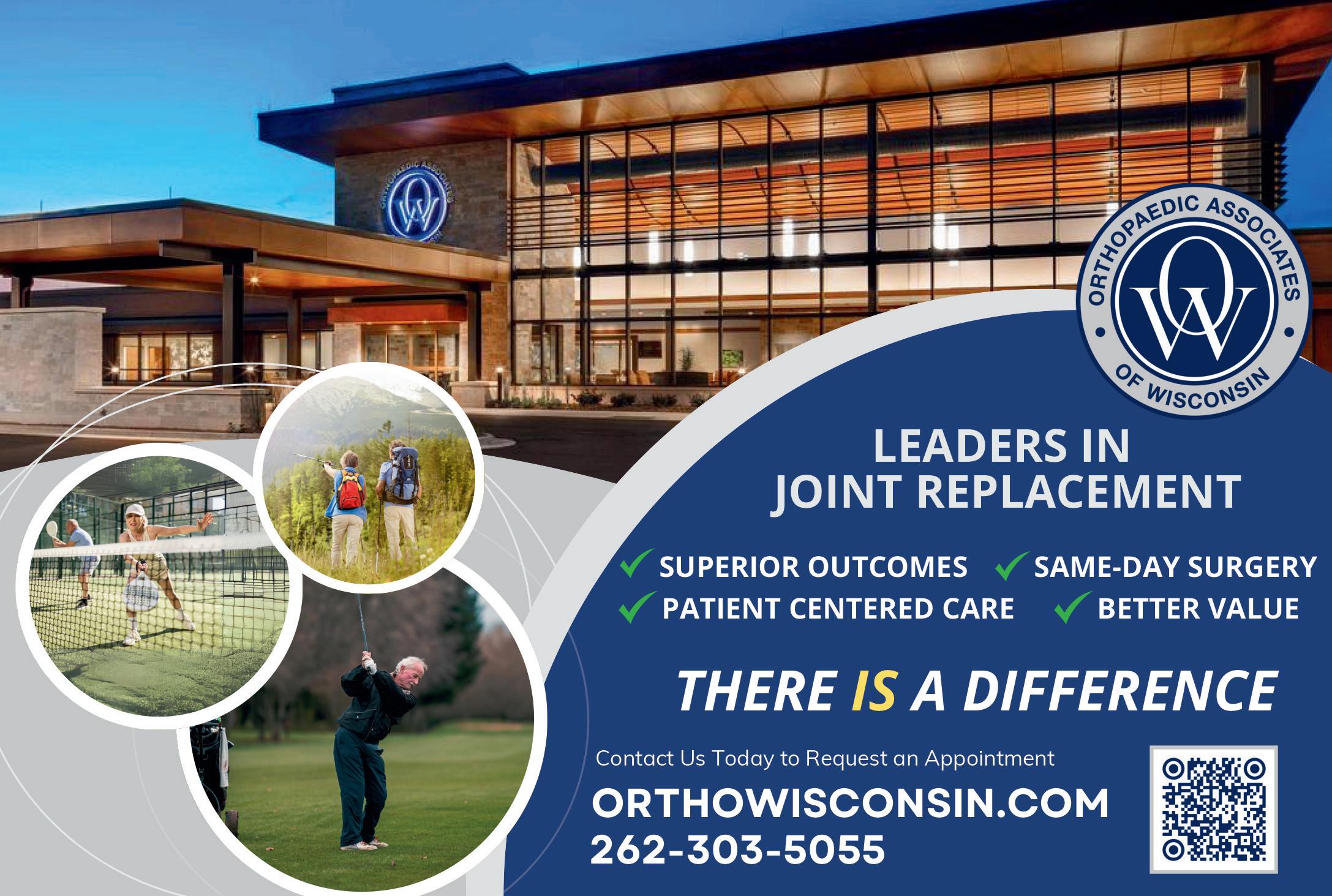Same-day joint replacement surgery, superior outcomes, patient-centered care, and better value are at the core of Orthopaedic Associates of Wisconsin’s approach to active aging. Many joint replacement patients return home on the same day and benefit from advanced techniques that enhance comfort, mobility, and long-term outcomes. With three convenient locations in Waukesha County and coordinated care across clinics, imaging, therapy and surgery, the team delivers efficient, personalized treatment that helps people stay active and independent as they age. orthowisconsin.com