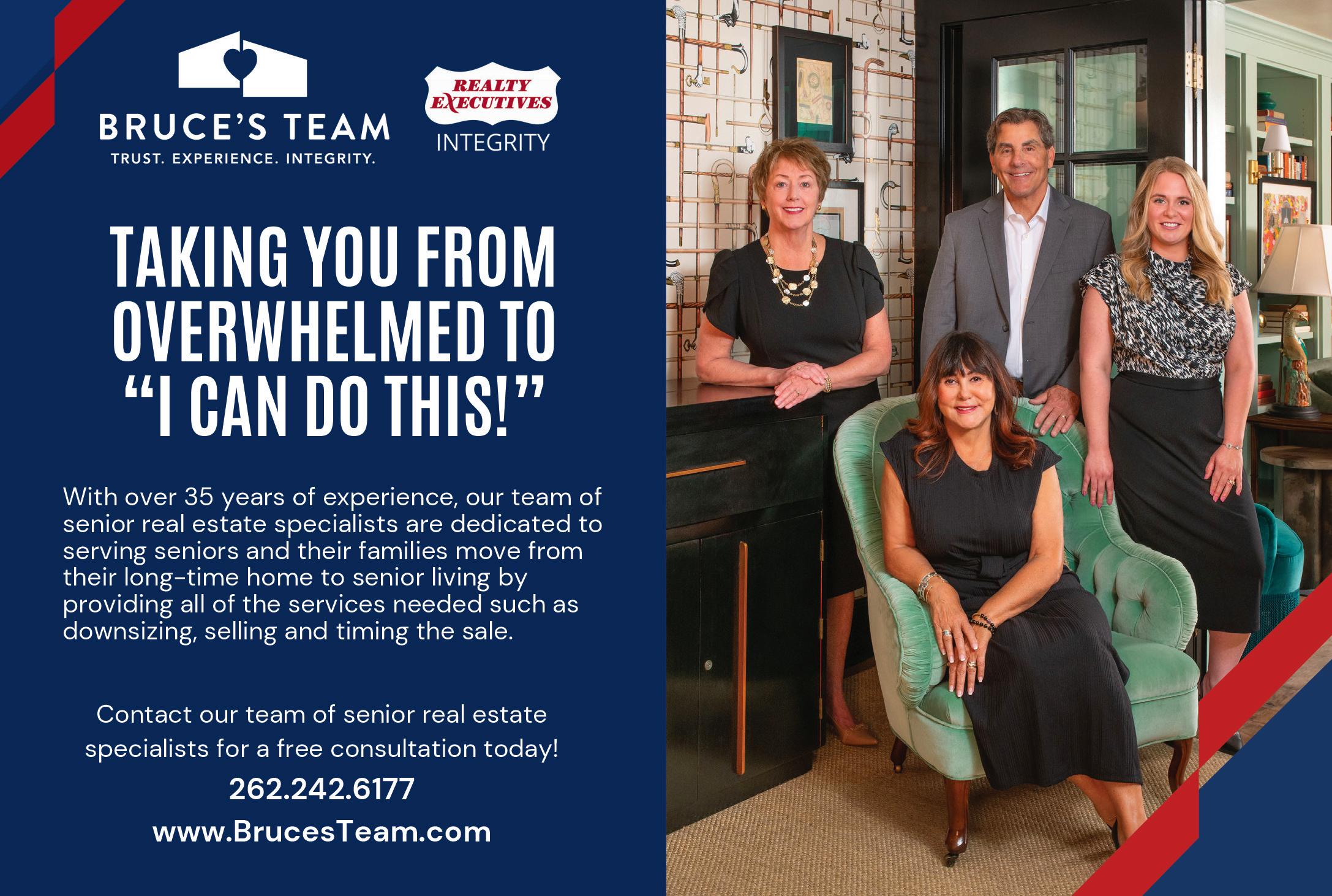The senior real estate specialists at Bruce’s Team focus on the needs of seniors and older adults when moving from their lifelong homes, whether their next chapter is senior living, a condo or downsizing to a smaller space. Bruce’s Team helps with everything from finding trusted contractors to navigating the home sale process. Learn more at one of Bruce’s Team’s many seminars where they educate the public on the emotional and practical realities of this major transition. brucesteam.com, 262-242-6177