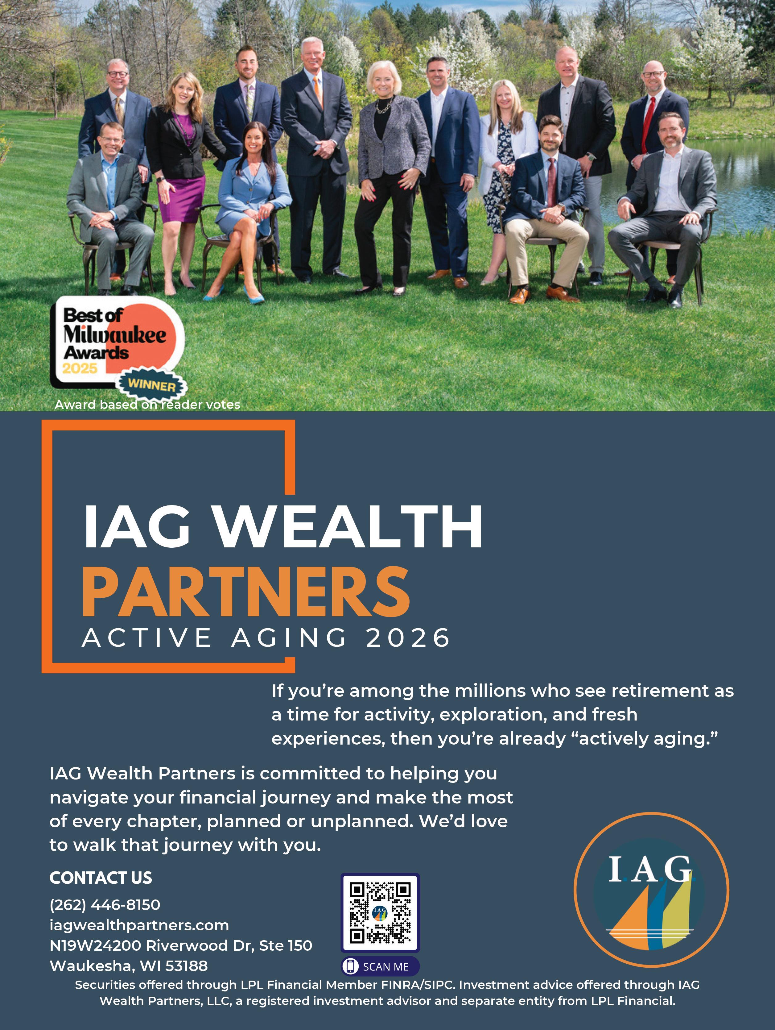 Retirement today offers more choices than ever. IAG Wealth Management helps couples nearing or already in retirement redefine those years, balancing purposeful living, financial security and meaningful generosity. A strong plan aligns income strategies, tax-efficient withdrawals and health care decisions with long-term goals. Many clients also explore planned giving to support causes they love while creating potential tax advantages and leaving a lasting legacy. The right guidance helps you enjoy life now while preparing for the future. IAG provides complimentary meetings to review retirement strategies and help to confidently establish a path to financial well-being. iagwealthpartners.com