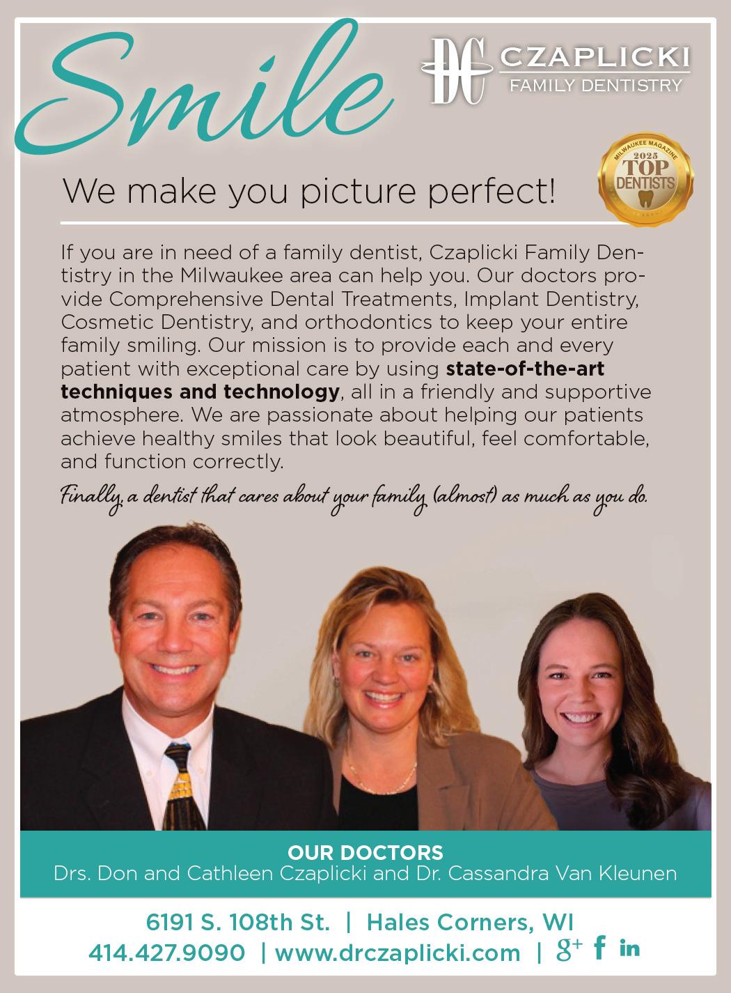Since 1989, Czaplicki Family Dental has helped transform the smiles of Southeastern Wisconsin. Led by Don and Cathy Czaplicki, the Czaplicki Family Dental team makes high-quality dentistry accessible and comfortable for all patients, from preventive care for children getting their adult teeth to emergency dental care when accidents strike. The board-certified dentists combine state-of-the-art technology with personalized and compassionate care. They offer everything from routine checkups to cosmetic transformations using Invisalign, ClearCorrect and veneers. drczaplicki.com