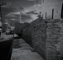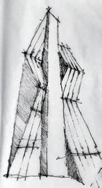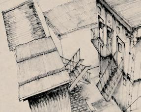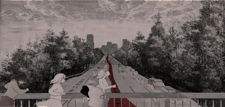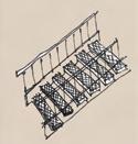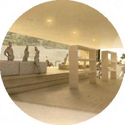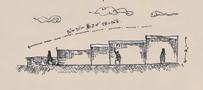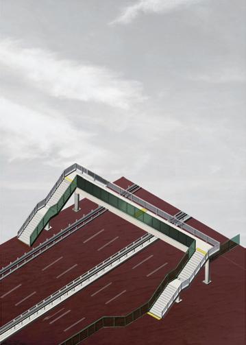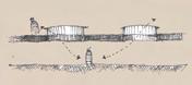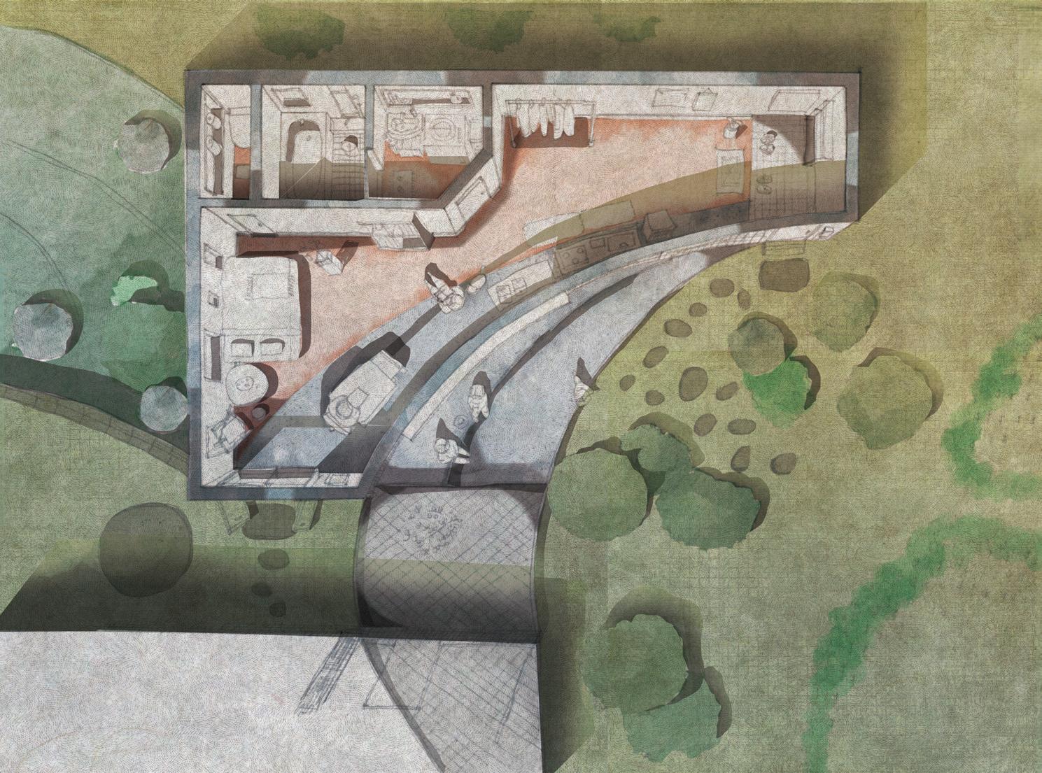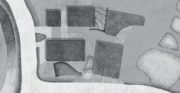人ãå²ã¶ãšãã æåãããã ãŸãŒãã³ã° æäŒ å¢å° æäŒãšå¢å°ã®è»žãšã1950幎代ã«åãç«ãŠãããæ·å°ã®è»žã«æ²¿ã£ãŠäºçš®é¡ã®éãèšç»ããã æäŒãšå¢å°ã®è»žã«ã¯æ¹ãžãŸã£ããçªãåºãæ¡æ©ãèšç»ãããã®æ¡æ©ã¯éæ©è¹ãšããŠæ©èœãã æ¡æ©ããå¢å°ãžåããåç·ãšãªããããäžã€ã®éã¯ãåãç«ãŠãããå°é¢ã«å¯ŸããŠå²žèŸºã åããæ°Žäžã®éå&éæ©éãèšç»ããã 1950sã« åãç«ãŠããã 岞蟺 ãéæ©è¹ã® ããã®æ¡æ©ã ãæ°Žäžã®éå ãéæ©éã