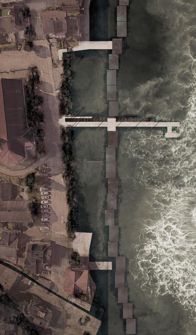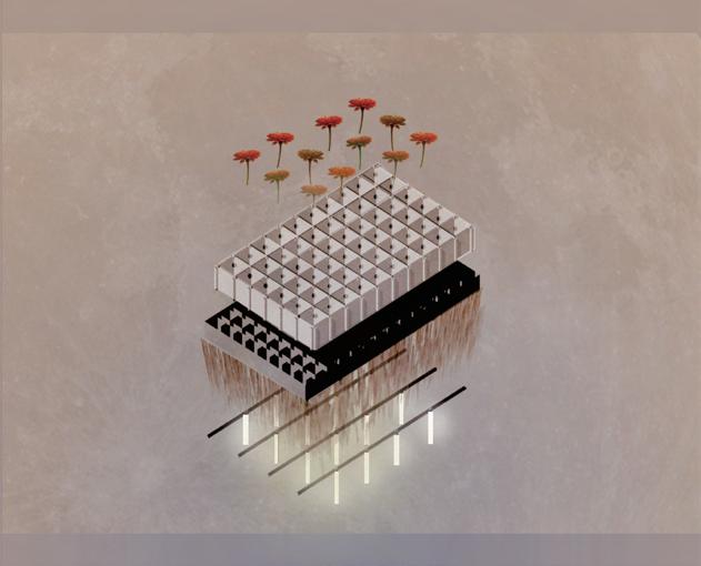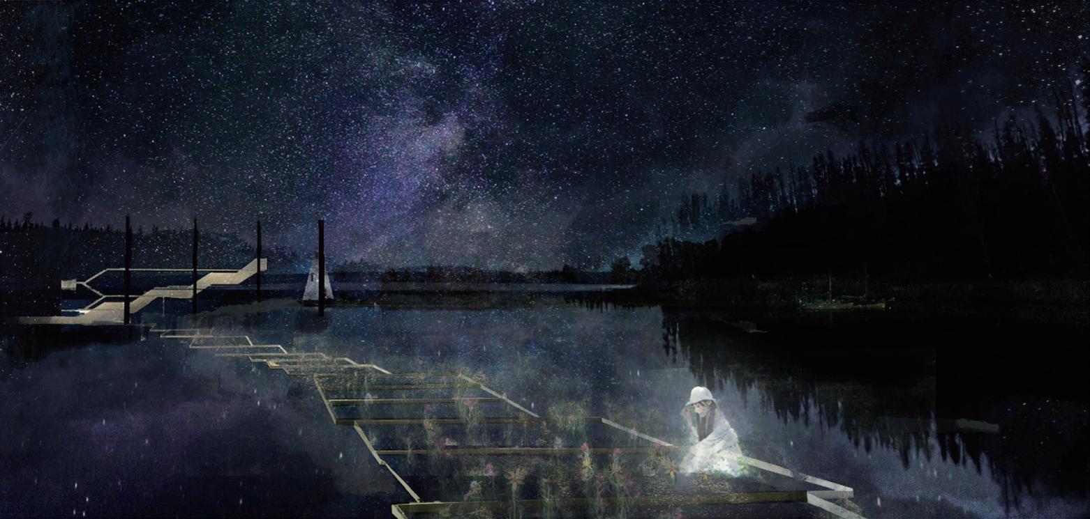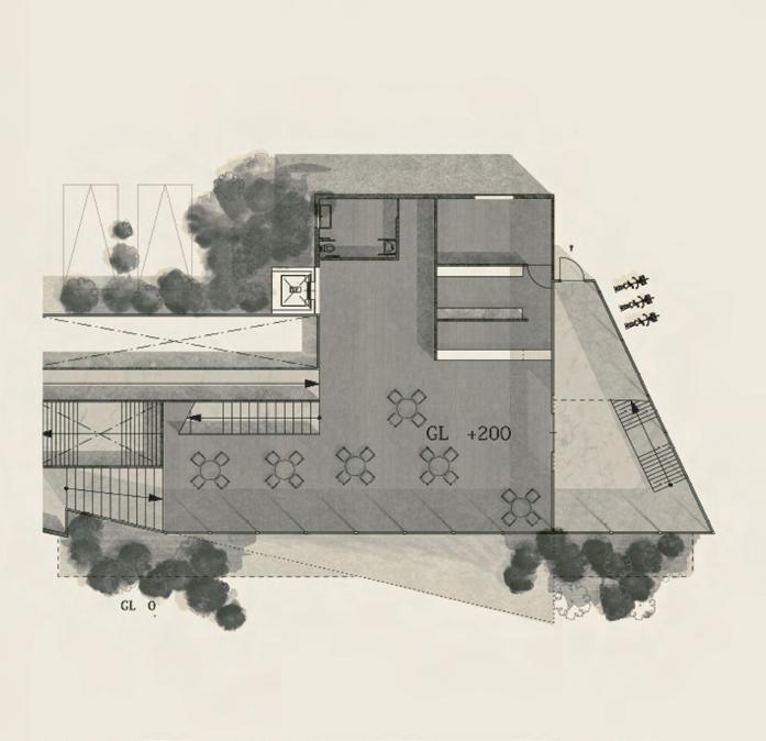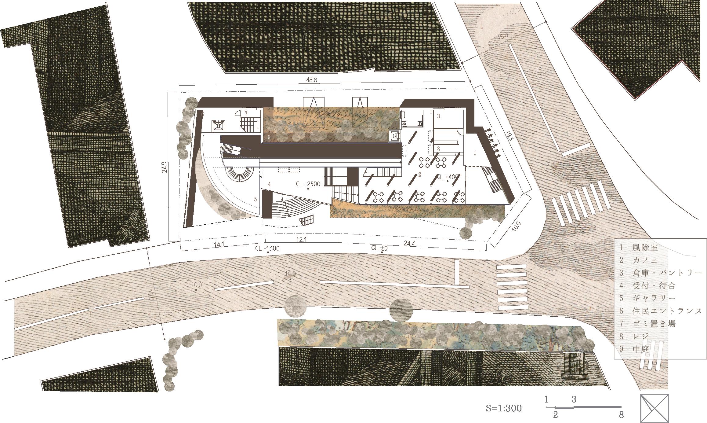 ¥ã蟌ãããšã§è±ãçããæ°Žã«æãæ¿ããã 人ãæäŒåã®ã¬ã©ã¹ãããã¯ã«è±ãæ¿ããŠããããšã§é¢šæ¯ãäœã£ãŠããã ã¬ã©ã¹ã«åå°ããè¶ãããªè±ã®è²ã¯æäŒåãçŸãã圩ã£ãŠããã ããã 03 10 M N Scale 1:300 1. æ°Žäžã®éæ©é 2. éæ©è¹ã®ããã®æ¡æ© ïŒ 2