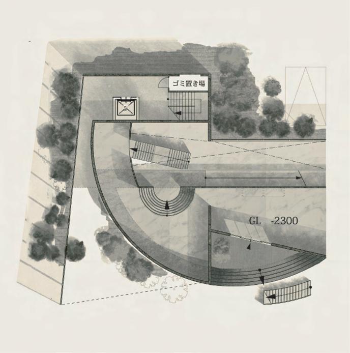å Žæãå°ãªãããšãã æ»çããããã®ç©ºéãäœããããããGLãšåã ã¬ãã«ã ãšäººã亀éãåçãªè¡šåéã§ã¯å¯ããªãã ãæ»çãå°ç€ãäžã«æã¡äžããããšã§ãåçãªè¡šå éã«ç·ãåŒãã®ãšåæã«å°ç€äžã屿 ¹ã«ãªãã人ã éãŸãã å°ç€å±æ ¹äžã«äººã®æµããåãæ¢ããããã®ããªã¥ ãŒã ãé