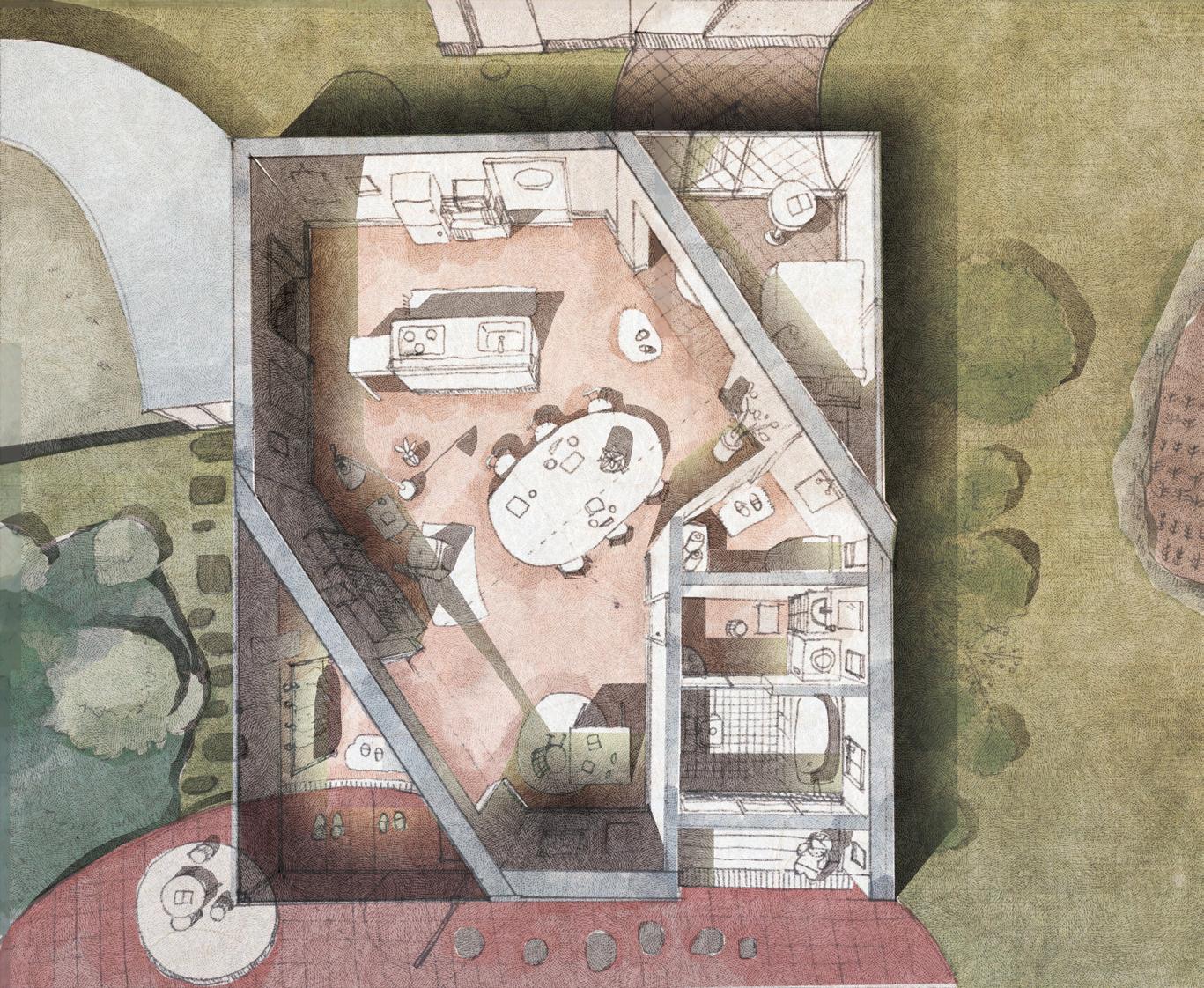 ã芳å¯ããäœäººããã®ããšãæèããŠæ®ãã ãããªãç©ã®å¯èŠåãã§ãã空éãäœã£ãã éå£ã®ãããäºéã®å£ã«ãã£ãŠãèŠç·ãé®ããªãããç©ãåçŽãããã³ã«å€éšã®ç掻ã®çè·¡ãå¯èŠåãã建ç©åšããå·¡åããããåç·èšç»ã«ãããå¬ã®æ¥ã«ã建 ç©ã®æãããç®å°ã«ç®çå°ã«èŸ¿ãçããšããåäœã®å»¶é·ç·äžã«ãã®äœå®